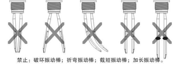 f.安装角度不正确(振动棒的表面因承受进料和卸料的高负荷压力而容易出现故障)。